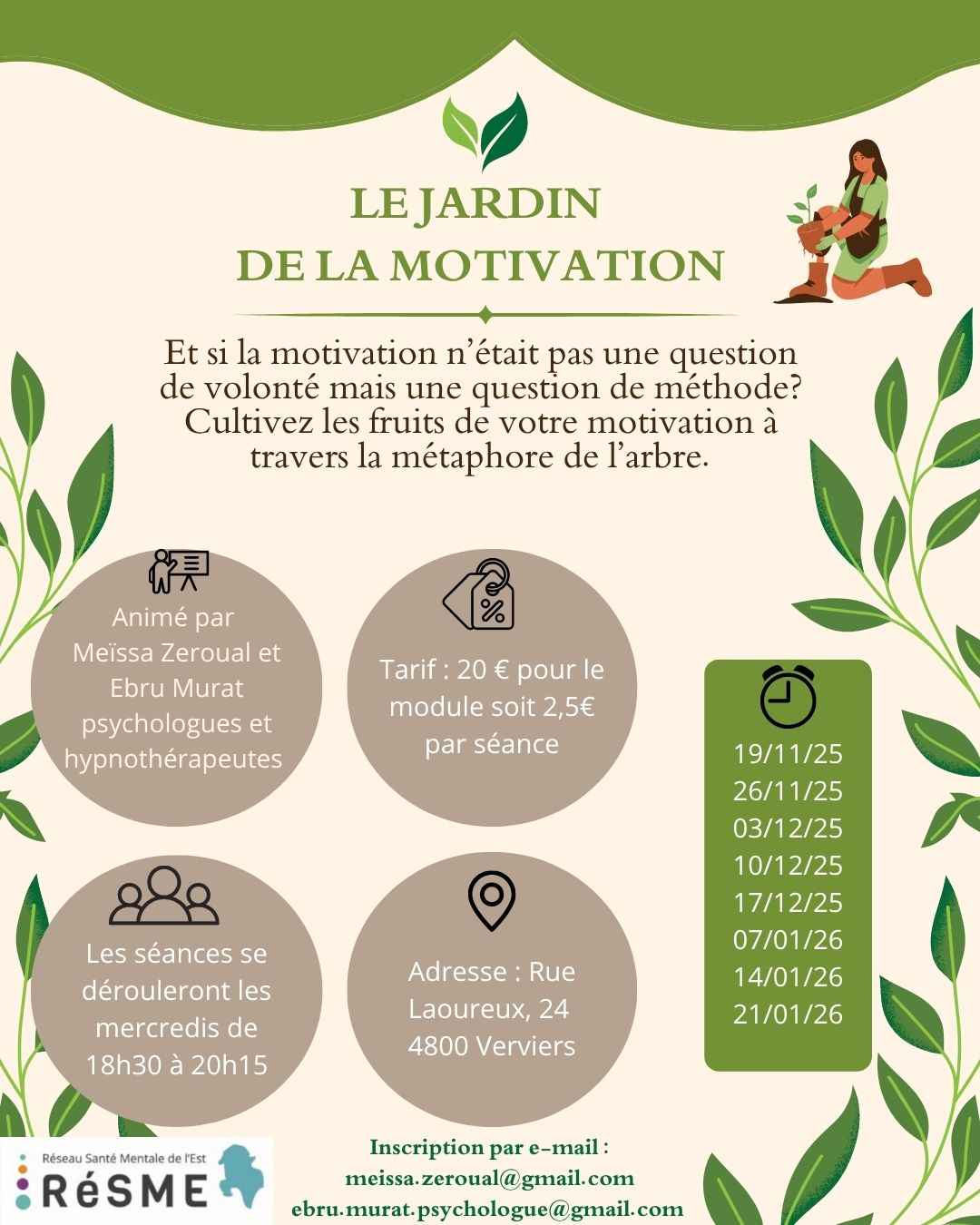 Inscription : Par e-mail : meissa.zeroual@gmail.com ou ebru.murat.psychologue@gmail.com